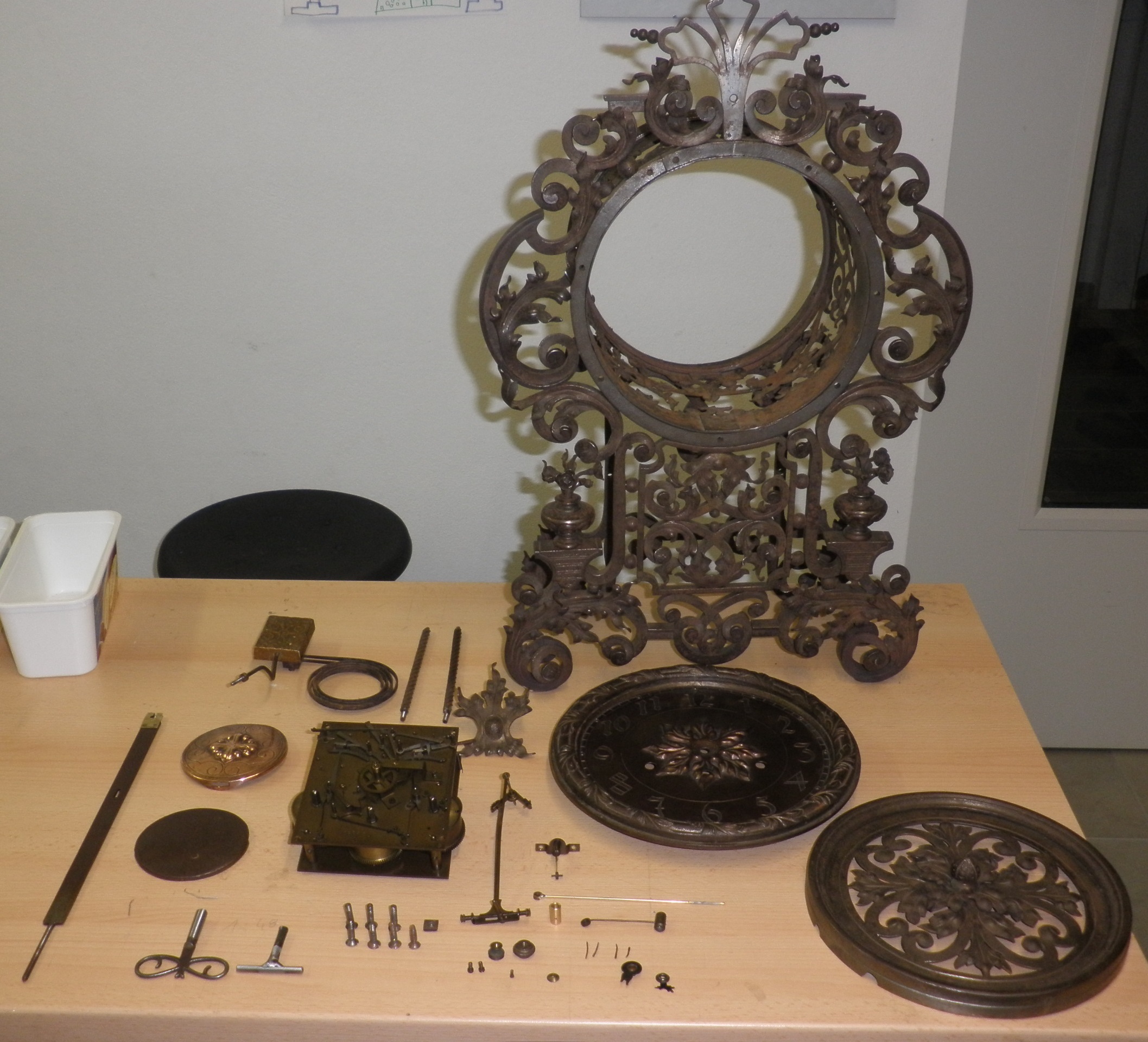 Es handelte sich dabei, um eine vom Ur-Ur-Großvater des Kunden handgefertigte Pendeluhr. Schmiedemeister Zemen (geb.ca. 1850) fertigte das Kunstwerk um ca. 1890 an. Das Uhrwerk ist ein sog. „Wiener 4/4 Vollschlagwerk“ - hat 2 Schlagwerke, die alle ¼ Stunde ausgelöst werden und damit die ¼ Stunden und vollen Stunden schlagt. Angetrieben wird das Ganze über drei Federtöpfe. Uhrwerke dieser Art wurden von 1880 bis 1910 gebaut.